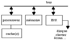 Les trois éléments essentiels d'un ordinateur sont, du moins pour ce qui nous concerne, le processeur, la mémoire et le dispositif de gestion des entrées-sorties. Ils communiquent entre eux par l'intermédiaire du bus. Schématiquement un ordinateur peut être symbolisé comme suit :