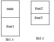 On imaginera, pour illustrer ces explications, un programme rangé dans deux fichiers de nom fic1.c et fic2.c (pour les systèmes Unix l'extension .c est obligatoire pour pouvoir compiler des sources écrites en langage C). Cette extension serait .f s'il s'agissait de Fortran. Le fichier fic1.c contient (fig. 6.2) le code du programme principal appelé main ainsi que celui d'une fonction appelée fonc1. Le fichier fic2.c contient: les fonctions fonc2 et fonc3. |