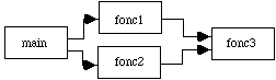 La figure 6.3 représente un organigramme possible: main appelle fonc1 et fonc2 successivement. fonc3 est appelée par fonc1 comme par fonc2. Cet organigramme n'est mentionné que pour illustrer le fait que le code complet d'un programme peut être rangé dans plusieurs fichiers. Il n'a aucun intérêt par lui-même. |