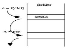 Imaginons une organisation où tous les articles auraient la même longueur. On peut alors calculer l'adresse, dans le fichier donc sur le disque, d'un article dont on connaît le rang. Si cette longueur fixe est de m octets, l'adresse a de l'article de rang n est a = (n - 1)*m. Pour accéder directement à l'article n, il suffit alors de se déplacer de a octets depuis le début du fichier. Encore faut-il connaître n.