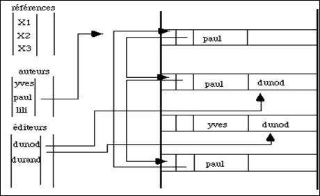 A partir d'une première valeur dans la table des auteurs, on retrouve rapidement un premier ouvrage de Paul, puis par les pointeurs successifs, l'ensemble de ses publications. Un deuxième pointeur permettent de parcourir cette liste en sens inverse. Seul le pointeur avant est montré dans ce dessin. Il permet de reconstruire cette structure au cas où un des pointeurs serait détérioré.