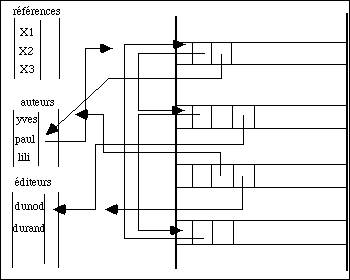 On construit trois tables d'index séparées pour les auteurs, les éditeurs et les références. A l'intérieur de chaque article on prévoit deux pointeurs afin de créer une liste circulaire des ouvrages et des auteurs (fig. 4.12).