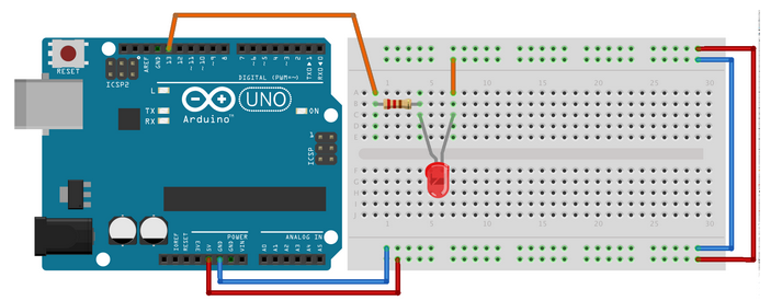 int pinLed=13; //variable pour le numéro du pin utilisé void setup() { pinMode(pinLed,OUTPUT); //le pin 13 en mode sortie de courant } void loop() { digitalWrite(pinLed,HIGH); // on passe le pin à +5V delay (1000); // attendre 1 seconde digitalWrite(pinLed,LOW); // on passe le pin à 0V delay(1000); } |