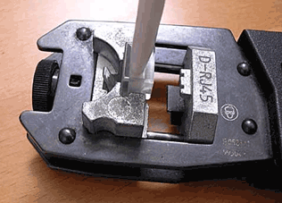 Au moyen de la pince à sertir, il faut finaliser le montage, en plaçant la prise dans l'encoche de la pince en prenant soin de ne pas retirer le câble de la prise, puis refermer la pince.