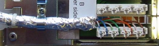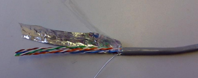 Pour câbler une prise sur la rampe, il faut tout d'abord étirer la gaine de protection extérieure sur une longueur d'environ 10 cm, en prenant bien soin de ne pas abîmer la feuille de blindage, retirer le film plastique transparent et enfin retrousser le blindage sur le câble, comme le montre l'illustration ci-dessous. ![]()