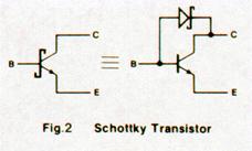 La mise en uvre d'une diode Schottky de pincement supplémentaire (figure 2) permet d'obtenir d'excellents résultats. Celle-ci est caractérisée notamment par une faible chute de tension directe (0,3 V), et se trouve montée entre la base et le collecteur. Lorsque le transistor arrive en saturation le courant d'entrée excédentaire ne transite plus par la base, mais se voit acheminé vers le collecteur via la diode de pincement. De sorte que le transistor n'est jamais tout à fait saturé d'une part et se bloque d'autre part aussitôt que le courant de base disparaît. Comme le dopage à base d'or n'est plus nécessaire, le gain en courant du transistor n'est pas affecté ; le courant de base peut être plus faible et la commutation du transistor se fait plus rapidement.Les types ALS et AS font appel à une technologie différente qui réduit considérablement les capacités parasites et le temps de propagation. Le rapport vitesse/dissipation est nettement meilleur que dans les technologies d'intégration antérieures. Par rapport à un circuit LS, le circuit ALS correspondant offre une vitesse sensiblement plus élevée pour une dissipation sensiblement plus faible. Tandis qu'un circuit du type AS offre, par rapport à son homonyme du type S, un temps de propagation deux fois plus court pour une dissipation identique.