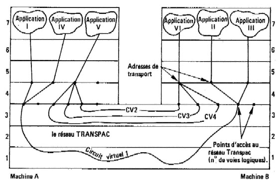 La figure 10.2 présente un exemple de connexions entre plusieurs utilisateurs situés sur deux machines distantes. Nous supposerons également que le réseau de communication utilisé est le réseau TRANSPAC.