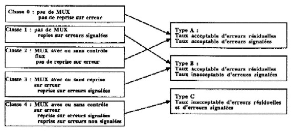 · Classe 4 : cette classe reprend les propriétés de la classe 3 avec en plus, la reprise sur erreurs non signalées par le réseau. Elle s'adapte donc parfaitement au réseau de type C.