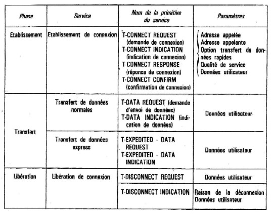 L'utilisateur du service de transport dispose d'un certain nombre de primitives pour chacune des phases de la connexion. Le tableau de la figure 10.6 résume l'ensemble de ces primitives dont les noms (en majuscules) sont les noms retenus par l'ISO. On peut, sur ce tableau, faire quelques remarques :