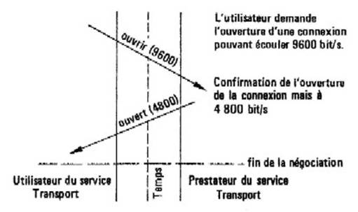 Nous avons vu précédemment que parmi les possibilités de la couche transport figurait la sélection d'une qualité de service. On peut se demander alors qui sélectionne cette qualité de service. La réponse est relativement simple : l'utilisateur du service de transport exprime son souhait en terme de qualité de service et le prestataire de service lui indique en réponse si oui ou non il peut satisfaire les exigences du client s'il ne le peut pas, il indique le mieux qu'il puisse faire par rapport aux demandes initiales. Ce processus s'appelle la négociation. Elle s'applique à chaque paramètre négociable d'une connexion de transport. La Figure 10.4 montre un exemple du déroulement «une telle négociation pour le choix du débit effectif d'information sur une connexion en cours Rétablissement. Dans une situation réelle tous les paramètres sont négociés de cette façon, soit successivement soit simultanément. De plus, dans certains cas des explications peuvent être fournies par le prestataire du service de transport indiquant les raisons du choix final. Nous verrons plus loin dans le cas d’un protocole réel comment se déroule la négociation des paramètres de qualité de service.