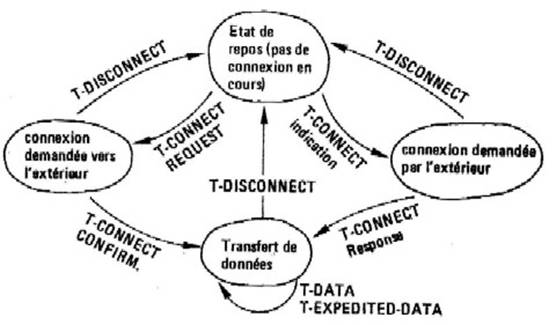 · dans la phase de connexion apparaît la négociation de la qualité de service désirée; la possibilité est offerte dans ce protocole d’échanger deux types de données : les données normales et les données express. Ces dernières sont de taille limitée et échappent au contrôle de flux.