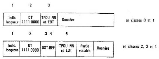 Il y a plusieurs formats valides pour les TPDUs DT suivant la classe de protocole en activité : un format pour les classes 0 et 1, un autre pour les classes 2, 3 et 4. La figure 10.14 rend compte de ces deux formats. Le champ DST-REF a la même signification que pour la TPDU CR. L'indication EOT signifiant la fin d'une suite de TPDUs représentant un message unique est signifiée par la mise à 1 des bits du champ TPDU-NR et EOT. Les bits 1 à 7 de ce champ représentent le numéro de séquence de la TPDU. Ils sont à 0 en classe 0. La partie variable de cette TPDU ne peut que contenir le paramètre de total de contrôle.