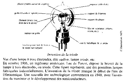 1906 Le 25 octobre de cette année, un ingénieur américain, Lee de Forest, dépose le brevet de la « lampe à trois électrodes », la triode. L'amplification des signaux télégraphiques et téléphoniques va devenir possible. L’ère de l'électronique commence.