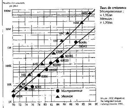 Les évolutions considérables observées dans le domaine des circuits intégrés ont de fortes chances de se poursuivre. Au plan technique, il est évident qu'on finira par se heurter à des barrières physiques (la nature granulaire de l'électricité et de la matière, en limites ultimes ... ). Mais on ne voit pas aujourd'hui de raison majeure pour que la plongée vers des miniaturisations de plus en plus poussées (et donc, à l'inverse, des intégrations de plus en plus élevées) ne se poursuive pas au même rythme jusqu'alors observé, au moins pour les dix ans à venir. La figure 1.2. montre l'évolution extraordinaire du nombre de transistors par puce depuis le début des années 1970.
